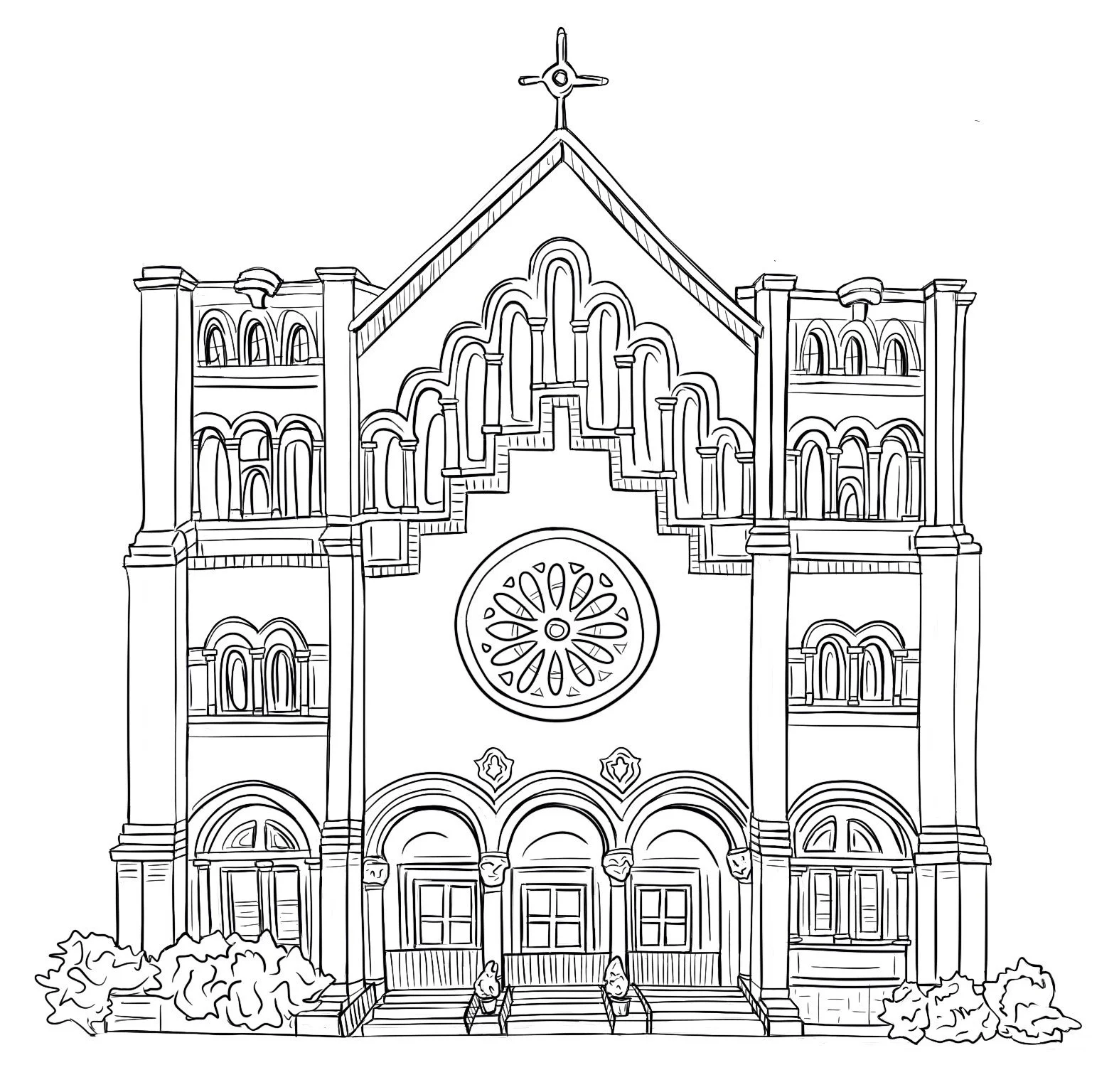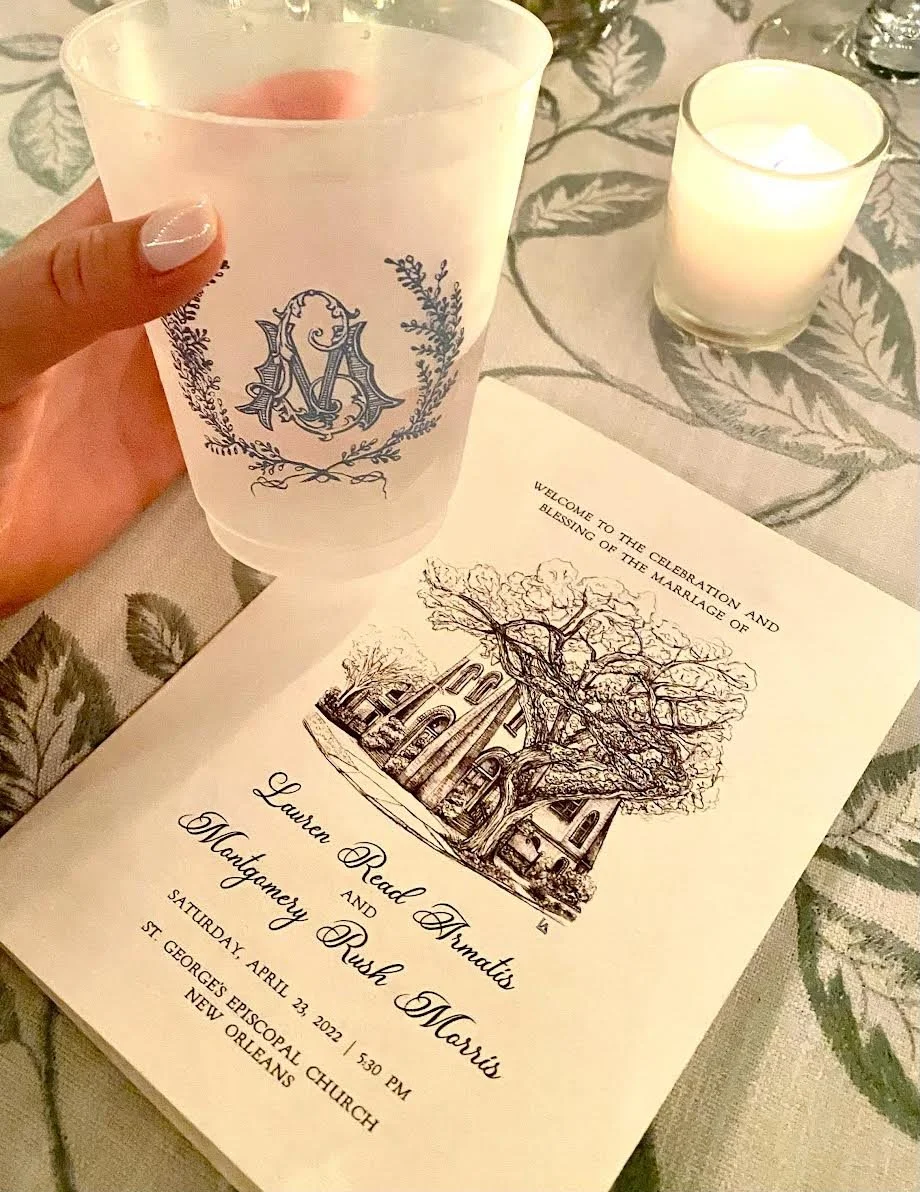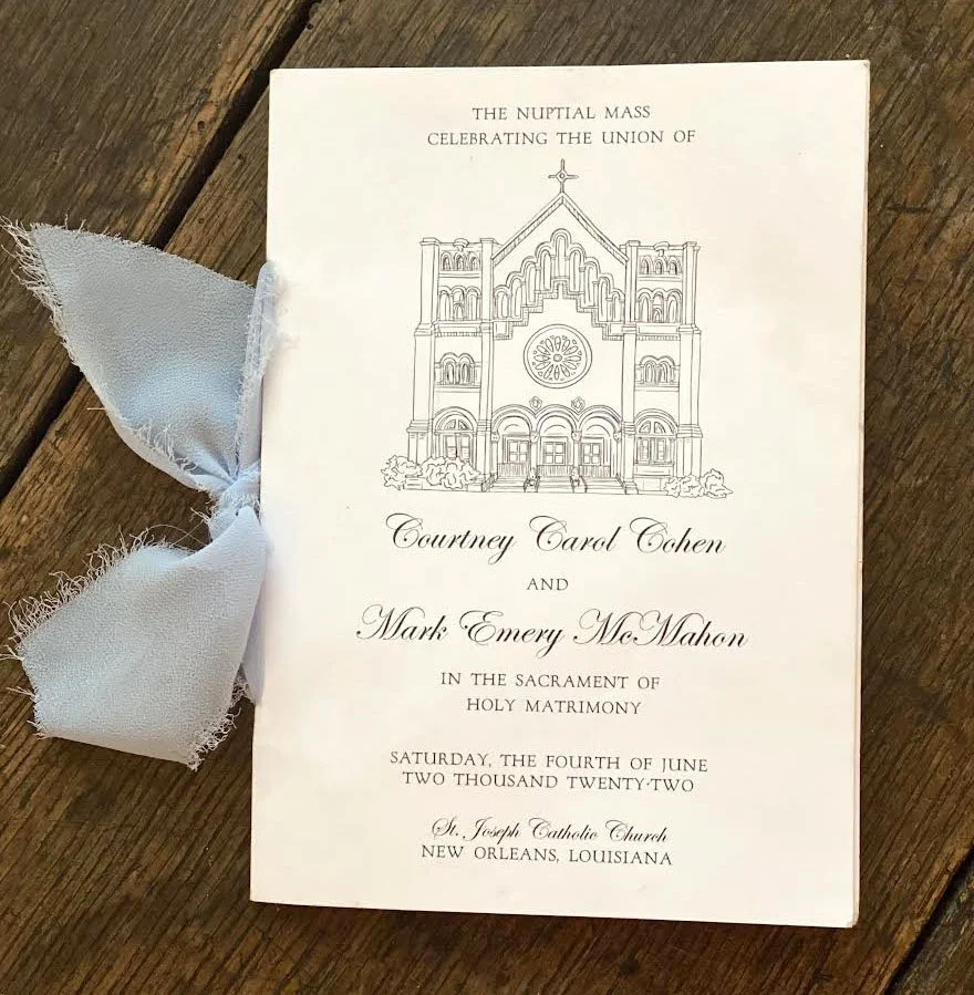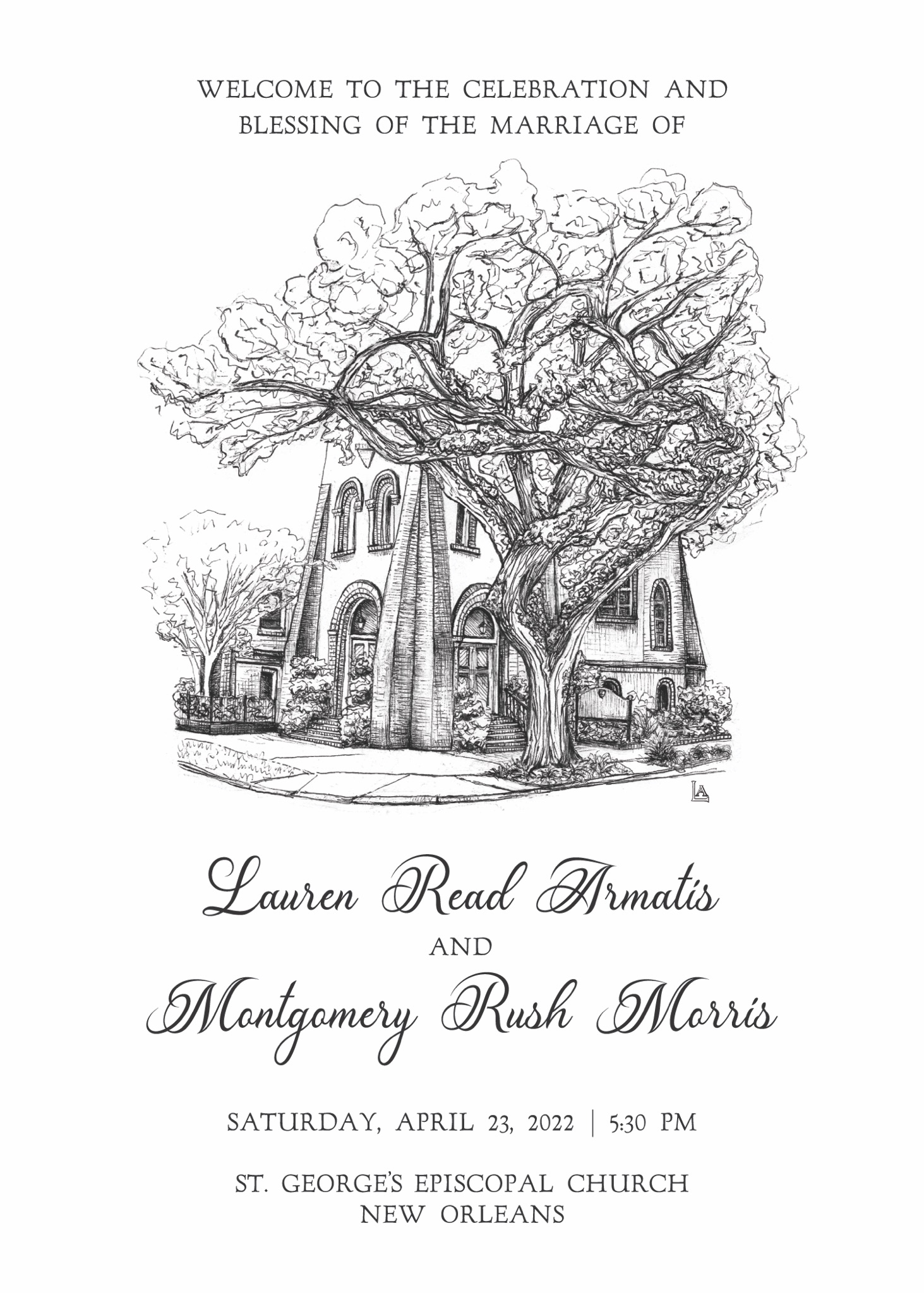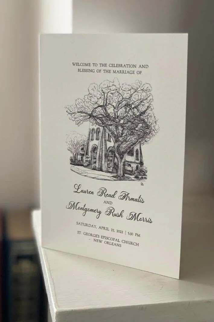 Illustration of the St. George’s Episcopal Church in New Orleans, LA. Clients were looking for a detailed, whimsical drawing of the church for their ceremony program. Hand drawn in pencil, pen and ink, then digitally rendered. Selected the typography and designed the inside layout as well to compliment the aesthetic of the church image.