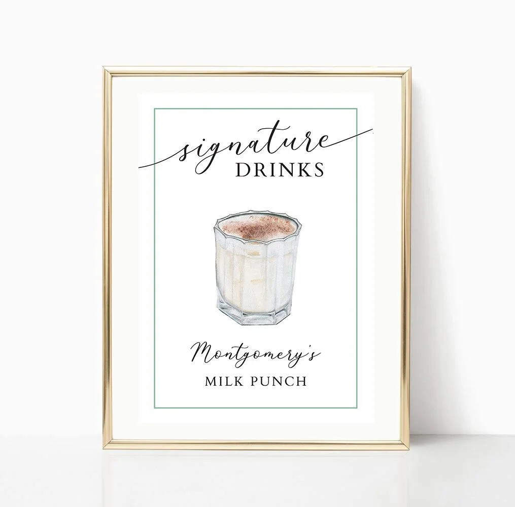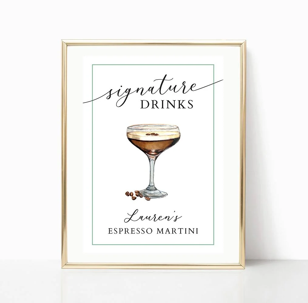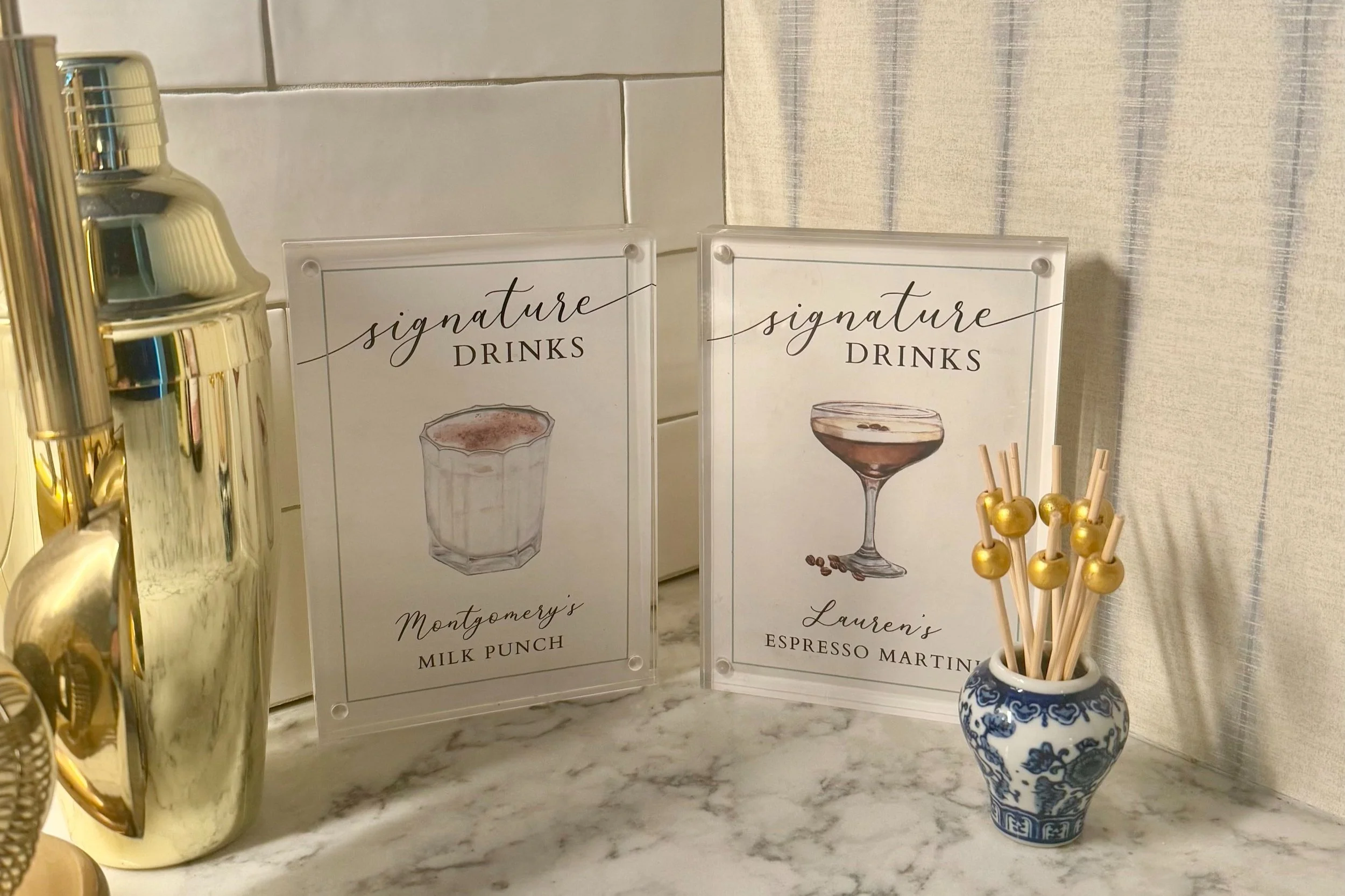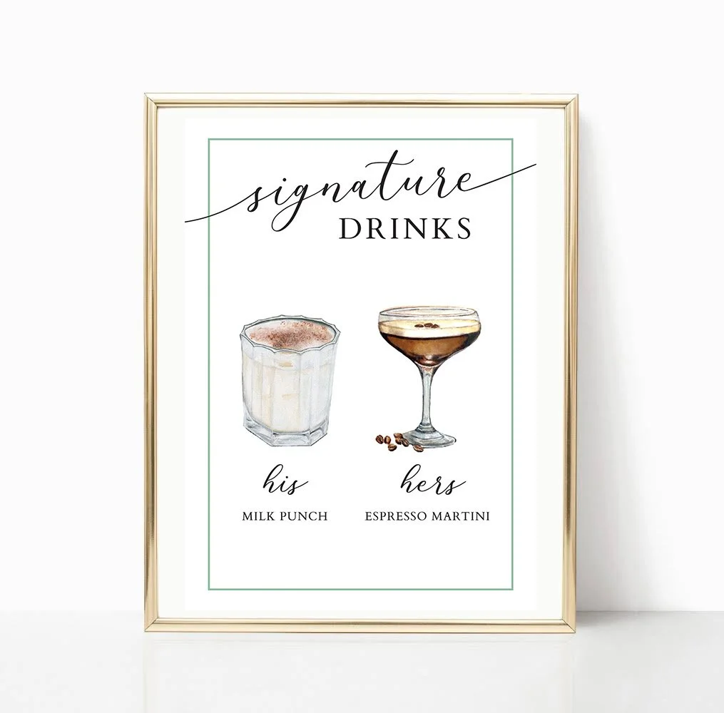 Signature Cocktail Signs Custom hand drawn and painted cocktails for bride and groom. Digitally rendered to create printed signs.